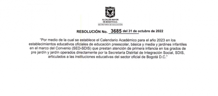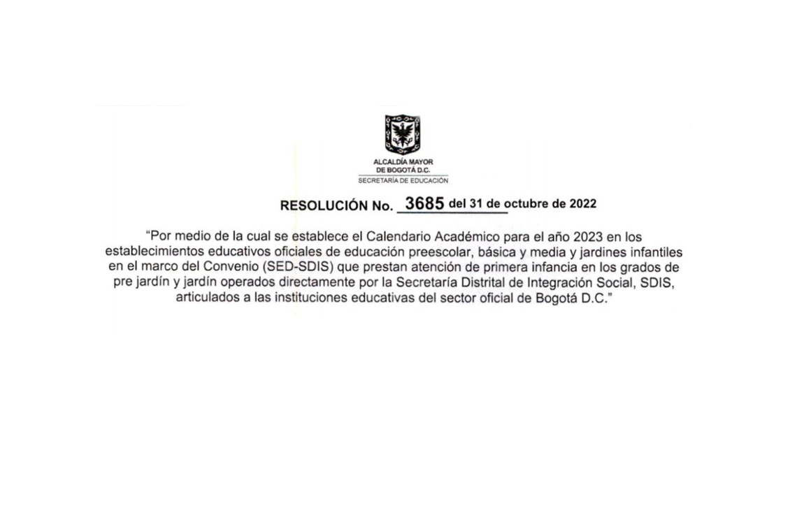 Por medio de la cual se establece el Calendario Académico para el año 2023 en los establecimientos educativos oficiales de educación preescolar, básica y media y jardines infantiles en el marco del Convenio (SED-SDIS) que prestan atención de primera infancia en los grados de pre jardín y jardín operados directamente por la Secretaria Distrital de Integración Social, SDIS, articulados a las instituciones educativas del sector oficial de Bogotá D.C. Descarga la Resolución 3685