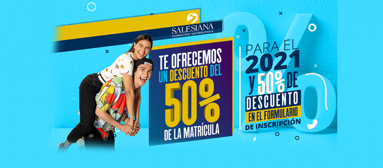 Con el fin de incentivar la inscripción de un mayor número de estudiantes a los programas de la Fundación Universitaria SALESIANA, la institución decidió mantener el beneficio del 50 % en el valor de sus matrículas para el primer semestre de 2021, situación que favorecerá a los jóvenes aspirantes, principalmente a aquellos de los estratos socioeconómicos de menores ingresos.