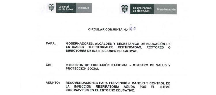 Bogotá D.C., marzo 9 de 2020. Los ministerios de Salud y Protección Social y de Educación a través de un trabajo articulado, emitieron la Circular N° 11, del 9 de marzo de 2020, dirigida a los gobernadores, alcaldes y secretarios de Educación y Salud, rectores o directores de Instituciones Educativas, en la cual se brindan recomendaciones para prevención, manejo y control de la infección respiratoria aguda por el nuevo coronavirus (COVID- 19), e invitan a la comunidad educativa a continuar la normalidad académica.