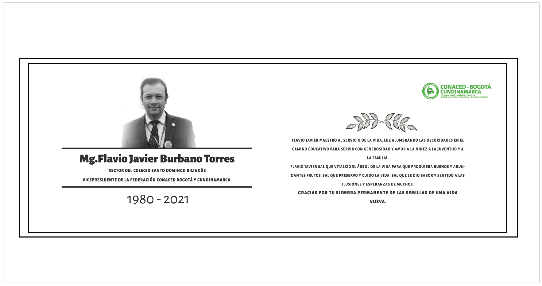 La Federación Católica de Educación, CONACED Bogotá & Cundinamarca, con este sencillo video, rinde un homenaje muy sentido al Mg. Flavio Javier Burbano Torres rector del colegio Santo Domingo Bilingüe, Vicepresidente de la Federación CONACED Bogotá y Cundinamarca