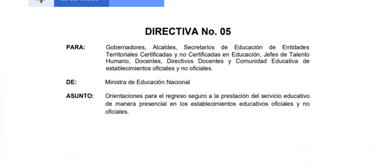 Conozca la directiva 05 de 2021, con orientaciones para el regreso seguro a la prestación del servicio educativo de manera presencial en los establecimientos educativos oficiales y no oficiales.