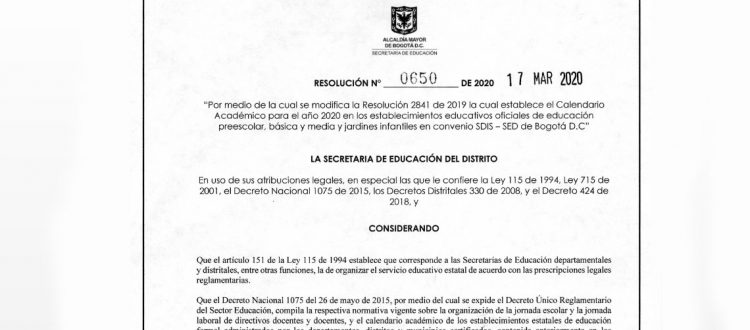 Nos permitimos informar, que la Secretaría de Educación del Distrito, mediante la RESOLUCION 0650 DE 2020.pdf, modifica la resolución 2851 de 2019, en la cual se estableció, para los colegios oficiales, el calendario académico para el 2020, organizado así: