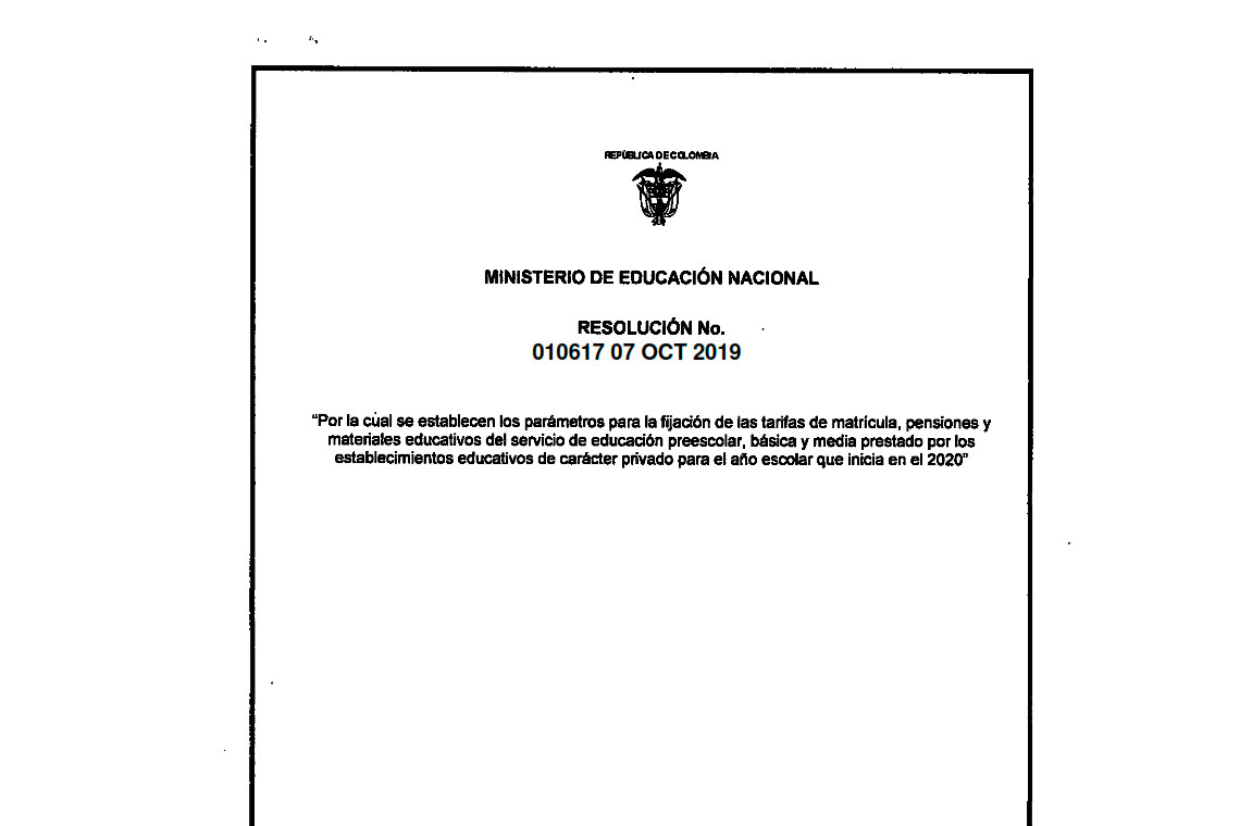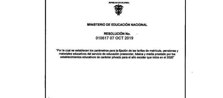 “Por la cial se establecen los parámetros para la fijación de las tarifas de matrícula, pensiones y materiales educativos del servicio de educación preescolar, básica y media prestado por los  establecimientos educativos de carácter privado para el año escolar que inicia en el 2020”