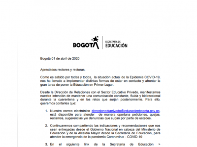 Bogotá 01 de abril de 2020 Apreciados rectores y rectoras, Como es sabido por todas y todos, la situación actual de la Epidemia COVID-19, nos ha llevado a implementar distintas... Leer Más