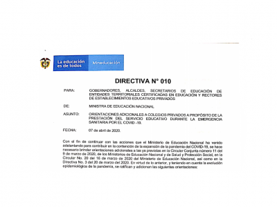 Orientaciones adicionales a colegios privados a propósito de la prestación del servicio educativo durante la emergencia sanitaria por el COVID-19 Lee y descarga: Directiva No 010 – 07 de abril... Leer Más